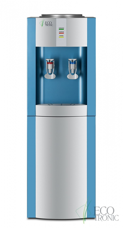 Кулер для воды Ecotronic H1-LC - базовая модель, цвет корпуса - металлик с синими вставками. Современный дизайн. В нижней части кулера Ecotronic H1-LC - удобный шкафчик для хранения принадлежностей на 16 л.